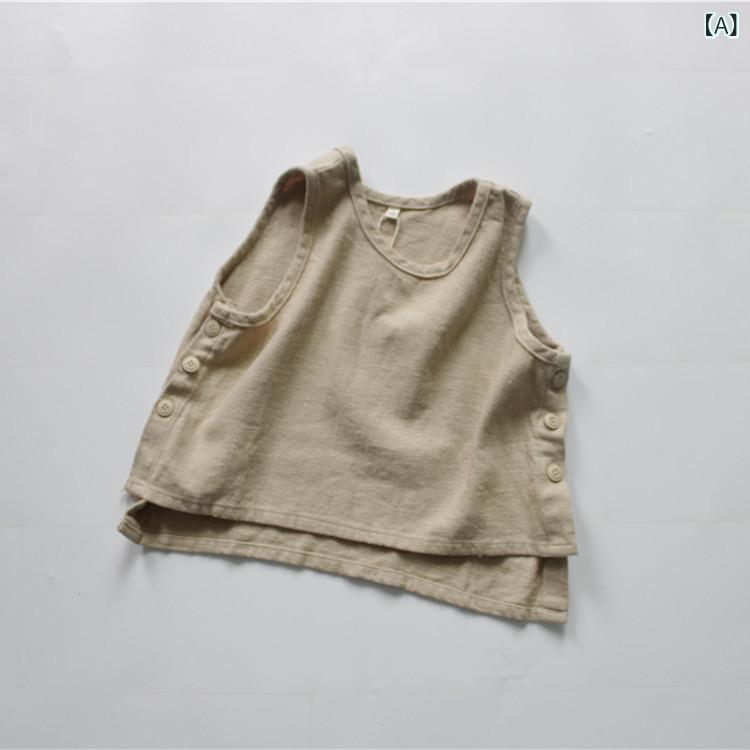 キッズ 男女兼用 接触冷感 通気性 綿麻 ゆったり ナチュラル 無地 カジュアル 着回し 普段着 ルームウェア 丸首 ノースリーブ ベスト 春夏