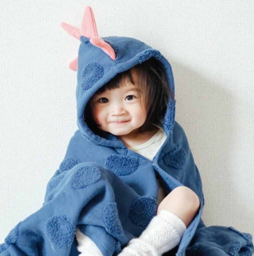 ソフ フード付バスタオル【 恐竜 】 お風呂上りに恐竜ごっこ!? 恐竜をモチーフにしたデザインが男の子はもちろん、女の子にも喜ばれそうなフード付バスタオルのご紹介です。 ■カラー■ イエロー/グレー/コバルトブルー/ネイビー/ライトピンク ■サイズ■ 58×115cm(フード部分除く) ■素材■ ・綿100% パイル部分には甘撚りの糸『無撚糸』を使用しました。 その織り上げた生地は繊維間にたくさんの空気を含むので、驚くほど軽くふんわりやわらかに仕上がりました。 た毛細管現象により、軽く肌に触れるだけでスッと水分を吸水してくれます。 ガーゼ部分は肌へのストレスが少ない、さらっとなめらかな風合いです。 両面パイルのタオルに比べて薄手なので、乾きの速さに驚きます。 速く乾いてくれるので、嫌なにおいがこもることなく、タオルを清潔に保てます。 また、お洗濯を重ねていくうちに空気を含みふわふわになるのも嬉しいポイントです。 出産祝いで人気のアイテム、フード付バスタオル。 新生児期には抱っこや寝かしつけの際、おくるみ代わりにご使用いただけます。 大きくなりやんちゃになってくると、お風呂上り裸のまま家中を走り回ることもしばしば。 フード付バスタオルは頭からバサッと服のように被せられるので、湯冷め防止になります。 また、ソフは恐竜になりきれるので、お風呂の時間が楽しくなり、子どもたちも大喜び! 海やプールでの水遊び時にもバスタオルとしてはもちろん、日除けとしても大活躍します。 インパクトのあるトゲの部分は柔らかいタオル素材なので、安心して小さなお子様にもご使用いただけます。 ソフは製織・加工・縫製・検品の全てを今治で行い、「今治タオルブランド認定商品」の承認をいただいております。 実用的でかわいい『ソフ』フード付バスタオル。ご自宅用はもちろん、出産祝いの贈り物としてもいかがでしょうか?