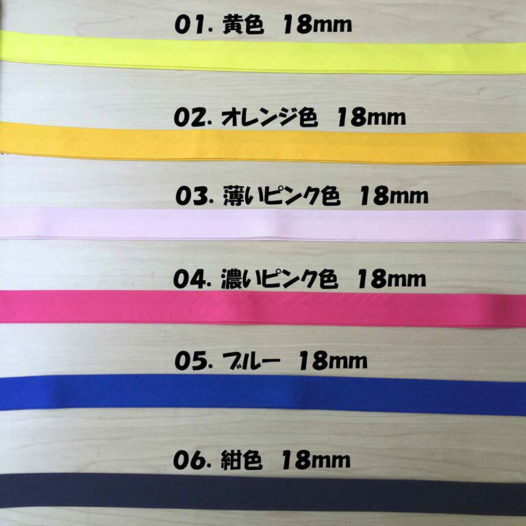 【バイアステープふちどり加工】18mm 黄色・オレンジ色・薄いピンク・濃いピンク・ブルー・紺色(バイアステープ代込み)
