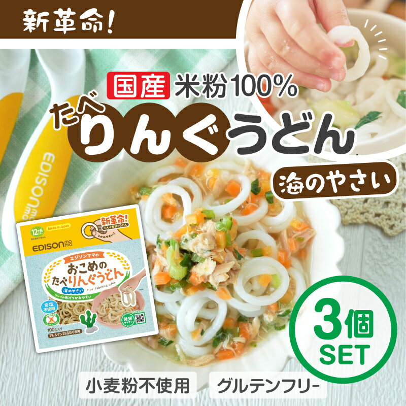 EDISONmama エジソンママ 【おこめのたべりんぐうどん「海のやさい」 】3個セット ヘビーフード 無添加 12ケ月〜 国産米粉100% ベビーうどん リング形状うどん アレルゲン28品目不使用 グルテンフリー 食塩不使用 時短キッチン うどん 乾麺 リングうどん 麺のカット手間なし