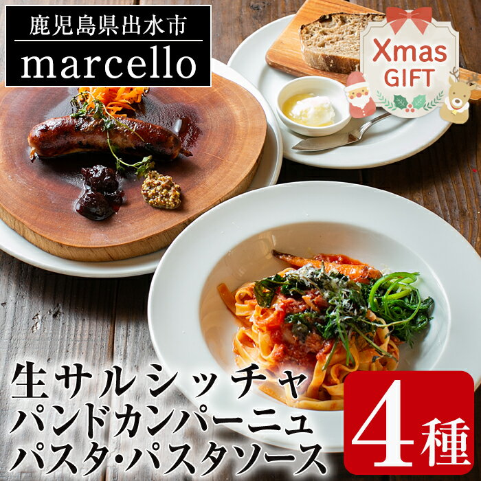 【ふるさと納税】【クリスマスギフト】鹿児島県出水市産六白黒豚の生サルシッチャ(プレーン)・カンパーニュ・パスタ詰め合わせ<計530g・4種セット> 豚肉 ソーセージ パン パスタ 詰め合わせ 生ソーセージ 天然酵母 生パスタ ギフト クリスマス プレゼント 【マルチェロ】