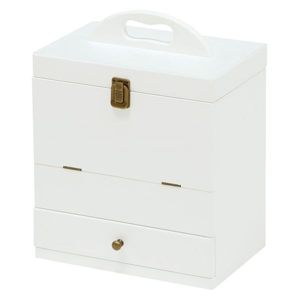 本商品はお取り寄せ商品のため、稀にご注文入れ違い等により欠品・遅延となる場合がございます。誠に恐れ入りますが、何卒ご了承ください。また、以下の場合には追加送料がかかる場合がございます。・北海道、沖縄、離島および一部地域への配送時【商品の色やサイズについて】こちらは「メイクボックス ピュアホワイト」の商品ページです。商品画像や説明文には色違いやサイズ違いの商品情報が載っている場合がございますのでご確認ください。■本商品のサイズ、色違い、関連商品はこちら【配送希望日時指定について】・この商品は、配送希望日と時間帯をご指定可能です。・配送希望日は出荷目安(最長)の 2 - 28 日後の間でご指定ください。・商品の入荷状況、配送地域、配送業者の状況等によって、配送日時のご希望に沿えない可能性がございます。・ご注文が土日祝日の前日の場合、最短での配送希望日を承ることができない可能性がございます。・最短での配送をご希望の場合は、指定なしでご注文ください。【ご注意事項】・商品注文後のキャンセルや返品は承りかねます。・商品は玄関での引き渡しとなります。室内への搬入や組立設置は承ることができません。商品スペック【材質】MDF【商品サイズ】(約)幅26.5cm×奥行21cm×高さ32.5cm(持ち手含)【内寸サイズ】(約)幅25cm×奥行19cm×高さ23.5cm【鏡サイズ】(約)幅20.5cm×高さ15cm+幅10.5cm×高さ15cm×2枚【前板サイズ】(約)幅26.5cm×奥行14.5cm【重量】約3.8kg【生産国】中国【梱包サイズ/重量】(約)30.5×26×37.5cm/(約)4.6kg商品内容メイク用品って、ついつい衝動買いして増えてしまいがち。ブランドや種類によって形やサイズが違うから、全部まとめてスッキリたっぷり収納できるメイクボックスって意外と見つからないんですよね。それに、ただ収納できれば良いわけでもない!使い勝手良く収納できて、シンプルでありながらお洒落感も欲しいですよね。 そんな女性の声をもとに、女性スタッフが考えた女性のためのメイクボックスです。 トール設計で収納力バツグン!パステルカラーのほんわか色合いで、お部屋の雰囲気に馴染みやすくお洒落感もバツグンです。 ほんわかカラーは、なんと5色!!ベビーピンク、ピュアホワイト、ナチュラルオレンジ、クリーミーイエロー、ミントグリーン、なかなか見つからないやわらかな癒されカラー。お部屋の雰囲気に合わせて選んでも・・、風水で選んでも・・。 使い勝手良く、バツグンの収納力!高さ32.5cm(持ち手含)のトール設計だから、背の高いボトルもスッポリ入ります。間仕切りがついているので種類別に分けて収納したり、チューブの立て置きをするのに便利です。上部のトレーには良く使う小物を入れるのにピッタリ♪トレーはスライド式なので、下部の取り出しの邪魔になりません。他にも、小物がたっぷり入れられる便利な引き出しが2つ付いて、ぐちゃぐちゃだった小物も、溢れ出ていた小物も、まとめてスッキリ収納できちゃいます。 収納力だけじゃない!優秀設計!!なんと!5段階まで調節できる大型三面鏡。口紅、マスカラ、、使いやすい角度で使えるから、おもしろいくらいメイクがキマル♪ミラーは大型だから、顔全体が映りこんで見落としなしの失敗知らず♪三面鏡になっているから横顔もチェックできて、勝負メイクだって完璧♪さらに、前板は倒してテーブルとして使用できる♪至れり尽くせりの設計! もう・・これさえあれば、どこでもドレッサー!!毎日のメイクタイムが楽しくて♪なんだかメイクも上手になったみたい! ■本商品のサイズ、色違い、関連商品はこちら