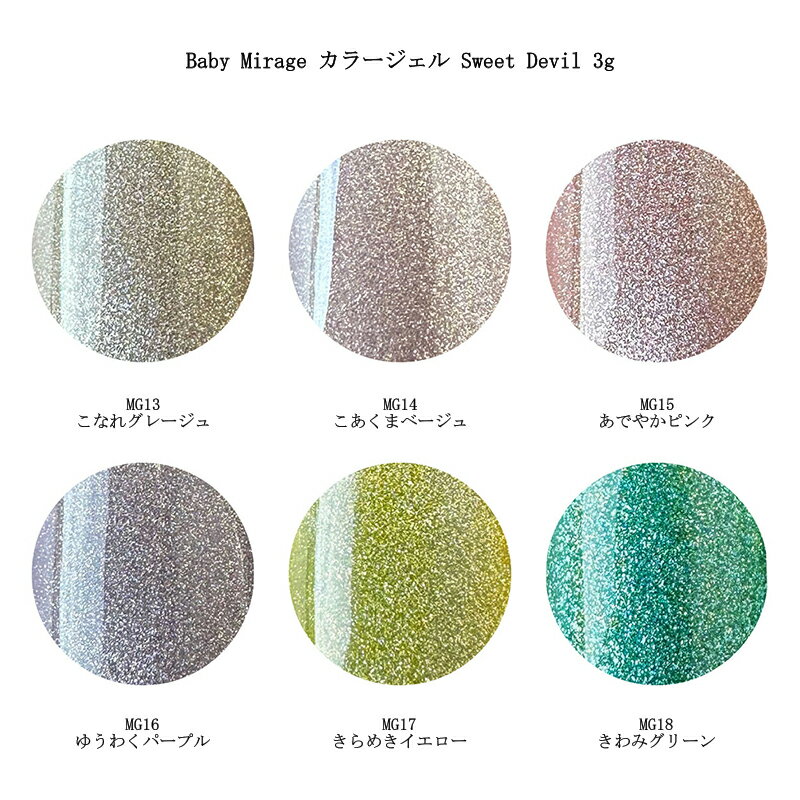 【最大3%OFF】 ベビーミラージュ Baby Mirage カラージェル Sweet Devil 3g 【6色からご選択】 MG13 MG14 MG15 MG16 MG17 MG18 マグネットシリーズ 透明感 パール キラキラ ナチュラル 小悪魔ネイル ジェルネイル ネイルカラー ネイルアート ネイルデザイン 新品 送料無料