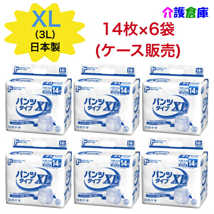 PUパンツタイプ XL 14枚入×6袋(ケース販売)約4回吸収/白十字/日本製/大きい人用/大きい人のはくパンツ/BIG/3L/大人用紙おむつ/紙オムツ/紙パンツ/リハパン/男女共用 大きいサイズ/はくパンツ/大きい人のはくパンツ/日本製/リフレはくパンツBIG同等品/リブドゥ/パンツタイプ/大人用紙おむつ/オムツ/白十字/ メーカー:白十字【リフレ 大きい人のはくパンツ 3L の同等品です】大きい人用の安心サイズ商品詳細ウエストサイズ :100~140cm 入数:1袋/14枚×6袋 (ケース販売)吸収量:約4回分(1回の排尿量を150mlとして、約600ml)生産国:日本特長・パンツ単体使用でも安心の4回吸収・横モレを防ぐ立体ギャザー・ムレを防ぐ全面通気シート・気になる臭いも安心、吸収ポリマー※商品パッケージや仕様は予告なく変更される場合がありますので予めご了承ください。※複数店舗で販売の為、表記している在庫と実在庫は異なる場合がございます。予めご了承下さい。※ケース販売分でもご注文内容によっては別の段ボールへ入れ替えて出荷する場合がございます。※メーカー梱包での配送をご希望の方は、ご注文時にその旨のご連絡をお願い致します。 5