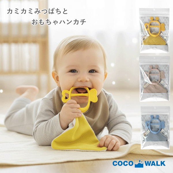 カミカミみつばちとおもちゃハンカチ サックス ピンク イエロー 日本製 無地 歯固め ハチ はち みつばち ファーストトイ ベビートイ プチプラ ギフト 出産祝い ベビーギフト プレゼント 男の子 女の子 ココウォーく COCOWALK 1点のみゆうパケット発送OK