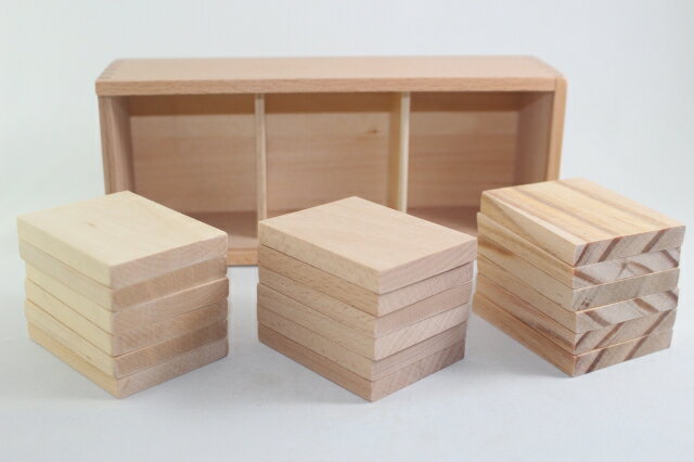 【プレミアム・ライン】 モンテッソーリ 重量板 Montessori Baric Tablets 知育玩具 感覚教育 Sensorial 推奨年齢 3歳以上 同じ大きさでも僅かに重さの異なる3種類の木のタブレット。微妙な質量の違いを認識します。木目の違いで異なる種類を見分けたりもします。様々な物体により質量が違うことを理解する為の導入となります。 木箱一つの大きさ: 横10.3 x 縦10.3 x 高さ6.7 cm タブレットの大きさ: 縦8x横6 x 0.6 cm このインドのメーカーは30年近くのモンテッソーリ教具製造の歴史があり、欧州はもとより、アメリカ、オーストラリア、中東など世界10,000を超えるモンテッソーリ幼稚園・学校に納入しております。 価格よりとにかく高品質なものをご希望の方へ「プレミアム・ライン」 ** 細かなモノや角があるものもありますので、3歳以下のお子様に与える際はご注意くださいませ。親の見守る前で遊ばせるようにしてください。誤飲やケガなどの責任は当店は負えません。免責にご同意いただいたうえでご購入お願い申し上げます。ゆうパックでの発送です。