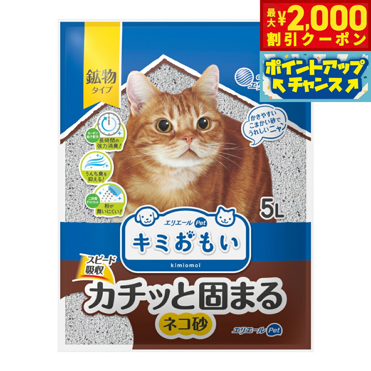 エリエール キミおもい カチッと固まる ネコ砂 5L 大王製紙 ▼a ペット グッズ 猫 キャット トイレ 猫砂 強力消臭 鉱物タイプ スピード吸収