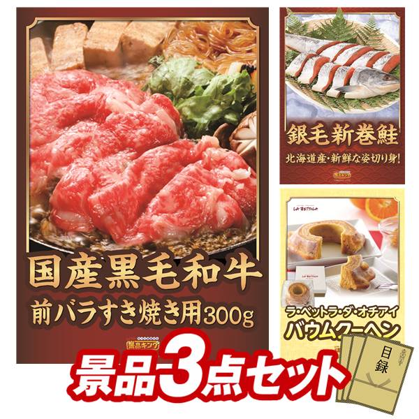 ランキング受賞★ ゴルフコンペ景品 3点セット 【国産黒毛和牛前バラすき焼き用300g、北海道産 銀毛新巻鮭姿切り身 他】 送料無料!特大パネル・目録・特典付き!