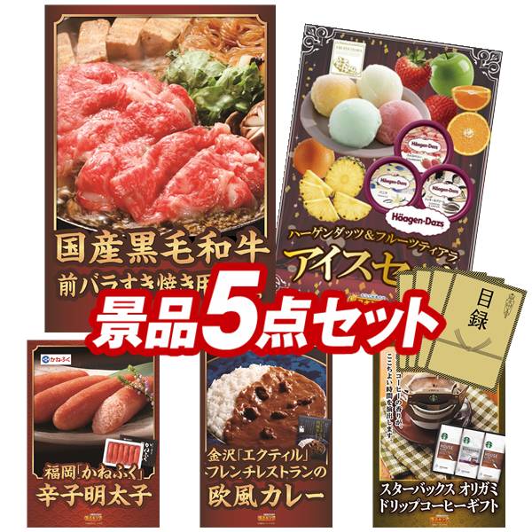 景品セット情報 販売価格 24,000円(送料・パネル代 全て込み) セット内容 景品5点/A3景品パネル5点/目録風お申し込み用紙 景品 お届け形態 数量 国産黒毛和牛前バラすき焼き用300gパネル&目録1ハーゲンダッツ&フルーツティアラアイスセットパネル&目録1福岡「かねふく」無着色からし明太子パネル&目録1「金沢エクティル」フレンチレストランの欧風カレーパネル&目録1スターバックス オリガミドリップコーヒー ギフトパネル&目録1 合計 5