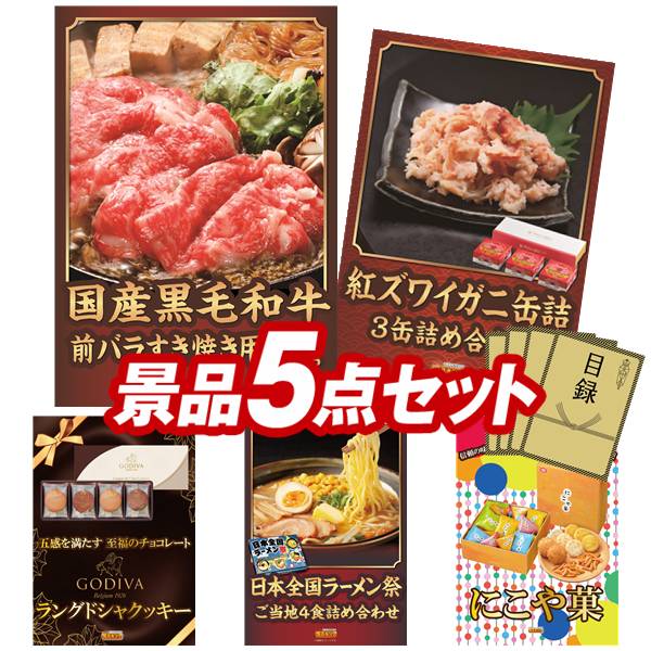 景品セット情報 販売価格 15,000円(送料・パネル代 全て込み) セット内容 景品5点/A3景品パネル5点/目録風お申し込み用紙 景品 お届け形態 数量 国産黒毛和牛前バラすき焼き用300gパネル&目録1紅ズワイガニ缶詰 3缶詰め合わせパネル&目録1GODIVA ラングドシャクッキー アソートメント8枚入りパネル&目録1日本全国ラーメン祭パネル&目録1にこや菓 SSパネル&目録1 合計 5