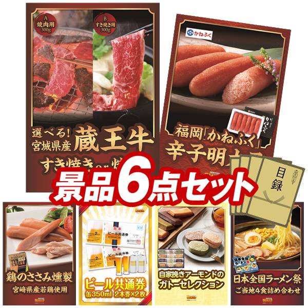 景品セット情報 販売価格 19,800円(送料・パネル代 全て込み) セット内容 景品6点/A3景品パネル6点/目録風お申し込み用紙 景品 お届け形態 数量 選べる!宮城県産蔵王牛(すき焼きor焼肉)パネル&目録1福岡「かねふく」無着色からし明太子パネル&目録1雲海物産鶏のささみ燻製パネル&目録1ビール共通券缶350ml(2本×2枚)パネル&目録1自家焼きアーモンドのガトーセレクションパネル&目録1日本全国ラーメン祭パネル&目録1 合計 6