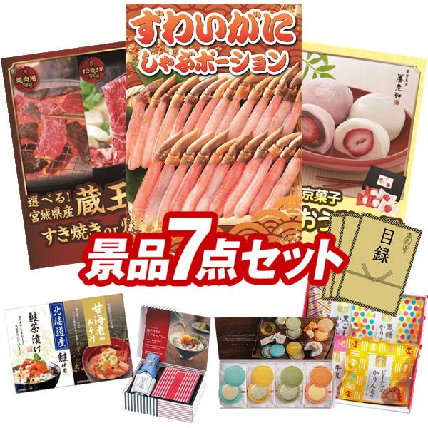 ランキング受賞★ ゴルフコンペ景品 7点セット 【ずわいがにしゃぶポーション、選べる!宮城県産蔵王牛(すき焼きor焼肉) 他】 送料無料!特大パネル・目録・特典付き!