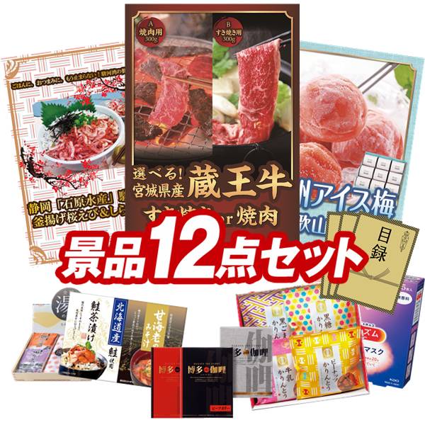 ランキング受賞★ ゴルフコンペ景品 12点セット 【選べる!宮城県産蔵王牛(すき焼きor焼肉)、静岡「石原水産」駿河湾産 釜揚げ桜えび&しらすセット 他】 送料無料!特大パネル・目録・特典付き!