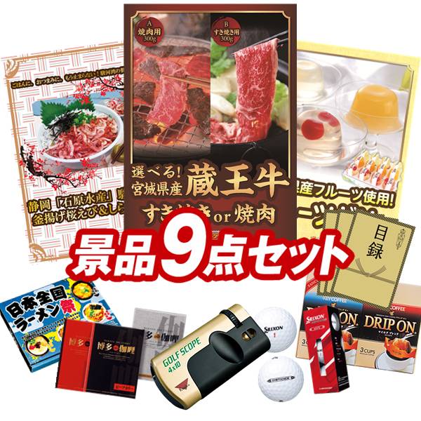 ランキング受賞★ ゴルフコンペ景品 9点セット 【選べる!宮城県産蔵王牛(すき焼きor焼肉)、静岡「石原水産」駿河湾産 釜揚げ桜えび&しらすセット 他】 送料無料!特大パネル・目録・特典付き!