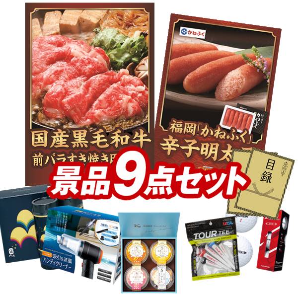 ランキング受賞★ ゴルフコンペ景品 9点セット 【国産黒毛和牛前バラすき焼き用300g、福岡「かねふく」無着色からし明太子 他】 送料無料!特大パネル・目録・特典付き!