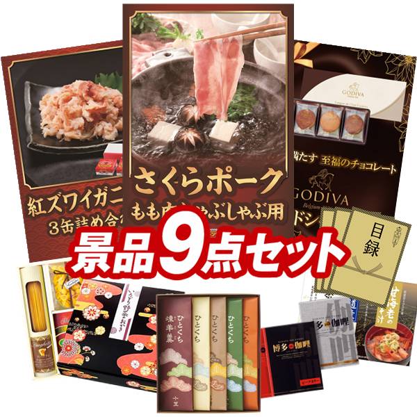 ランキング受賞★ ゴルフコンペ景品 9点セット 【さくらポークモモしゃぶしゃぶ用、紅ズワイガニ缶詰 3缶詰め合わせ 他】 送料無料!特大パネル・目録・特典付き!