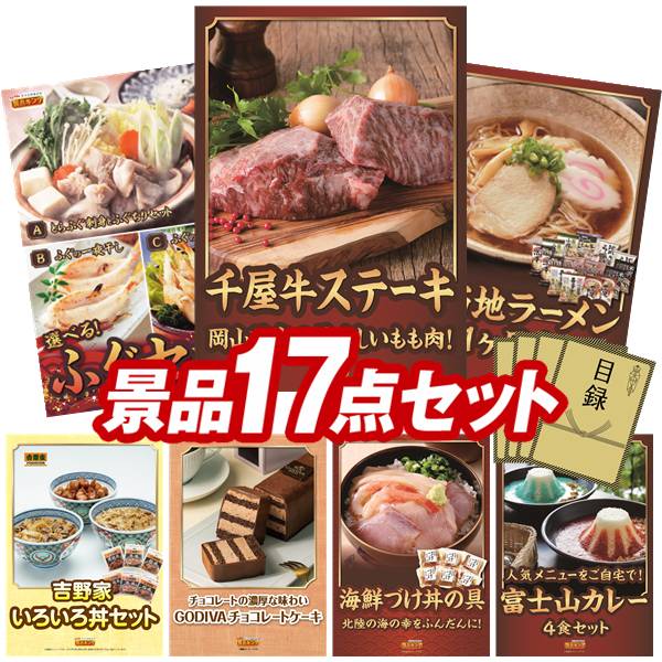 景品セット情報 販売価格 80,000円(送料・パネル代 全て込み) セット内容 景品17点/A3景品パネル11点/目録風お申し込み用紙 景品 お届け形態 数量 岡山県産 千屋牛ステーキ(モモ)パネル&目録1選べるふぐセットパネル&目録1ご当地ラーメン味くらべ乾麺1ヶ月分30食パネル&目録1吉野家 いろいろ丼セットパネル&目録1GODIVAチョコレートケーキパネル&目録1北陸海鮮づけ丼の具パネル&目録1富士山カレーギフト4食セットパネル&目録1スターバックス オリガミドリップコーヒー ギフトパネル&目録1柿ピー(柿の種&ピーナッツ) 1kgパネル&目録1GODIVA ラングドシャクッキー アソートメント8枚入りパネル&目録4ベビースターラーメン 1ヶ月分パネル&目録4 合計 17