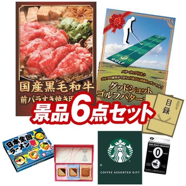 景品セット情報 販売価格 13,800円(送料・パネル代 全て込み) セット内容 景品6点/A3景品パネル2点/目録風お申し込み用紙/お持ち帰り用バッグ 景品 お届け形態 数量 国産黒毛和牛前バラすき焼き用300gパネル&目録1グッドショット ゴルフパターマットパネル&目録1スターバックス コーヒーアソートギフト現物1コロンバン メルヴェイユ現物1日本全国ラーメン祭現物1ワンリセットカウンター現物1 合計 6