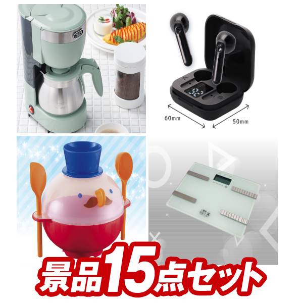 景品セット情報 販売価格 20,000円(税込み) セット内容 追加用景品15点/お持ち帰り用バッグ 備考本商品は追加用の商品となります。通常の景品セットと一緒のご購入をオススメいたします。本商品のみ購入のお客様は、別途720円の送料が加算されますことをご了承くださいませ。 景品 お届け形態 数量 Toffy 5カップアロマコーヒーメーカー現物1ワイヤレスイヤホン現物1チンしてキャラメルポップコーン現物1USB充電式 吸引&送風ハンディクリーナー現物1リトルアナザートリップ(バスソルト5種)現物1緊急脱出ハンマーダッシュ現物1ふんわりお菓子 めんたいこ味現物1リラフィ電動リフレッシュブラシ現物1WEDGWOOD紅茶セット(ティーバッグ9P)現物1JOY カラフルキッチンセット現物1二層バームクーヘン現物1クールネックリング現物1ダニサバタークッキー現物1お菓子詰め合わせ現物1ローラークリーナー現物1 合計 15