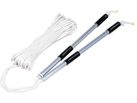 軽量でまわしやすいアルミパイプの長なわ。安定感抜群のスタンダードグリップ'長さ:30m、グリップ65cm重さ:1.8kg素材:グリップ/アルミ製直径25mm、ロープ/ポリエチレン9mm金剛打長さ調節可能専用ナイロンケース付、SGマーク【カラー】ナワトビ30SR