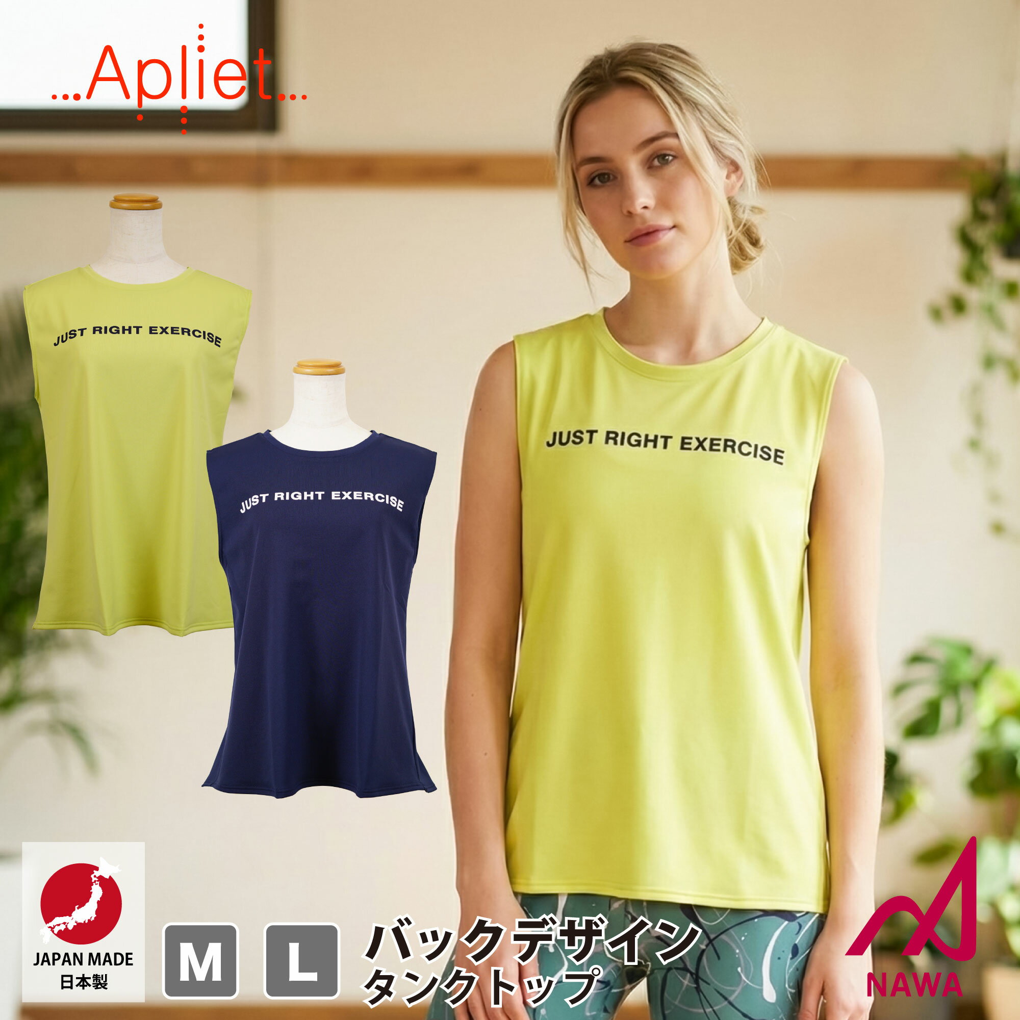 フィットネスウェア 日本製の高品質ウェア【Apliet】 アプリエット 【2色×2サイズ】バックデザインタンクトップ(ロゴ) スポーツ ウェア トレーニング ジム レディース ダンス エアロ ヨガ トップス タンクトップ 【NAWA】名和