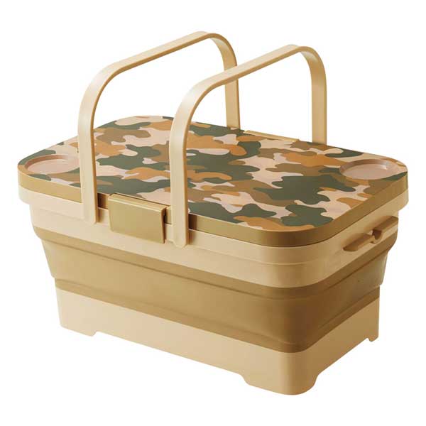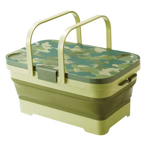 PICK UP BRANDフタがテーブルになるたっぷり入るバスケット 使用後は折りたたんでコンパクトに収納できるバスケット&テーブル。両手で本体をしっかり持って、同時に押し下げると簡単にコンパクトにたためます。広げ方も底を押さえながら本体の左右を交互に引き上げるだけ。 バーベキューなどのアウトドアシーンで荷物を運んだり、中に氷水を入れてドリンクを冷やしたりと大活躍。野菜やフルーツを洗いにも使えます。 バスケットの容量は15リットルでたっぷり入ります。 フタは外すと脚付きのテーブルに早変わり。飲み物を安定して置けるドリンクホルダーも2個ついています。 食べ終わったら水を溜めて食器洗いとしても便利。便利な水抜き栓付きで水抜きも簡単です。 品名 折りたたみバスケット&テーブル ミラーゴ I-582 カラー グリーン/カーキ サイズ 折りたたみ時:約46.3×29×8.6cm 組み立て時:約46.3×29×21.4cm 容量 15L 重量 約1,552g 材質 本体,水抜き栓:熱可塑性エラストマー(耐熱温度:100℃、耐冷温度:-20℃) 枠,底,ハンドル,止め具:ポリプロピレン テーブル:ABS樹脂(耐熱温度:80℃、耐冷温度:-20℃) 脚:鉄,ユニクロメッキ 製造元 ISETO 生産国 日本