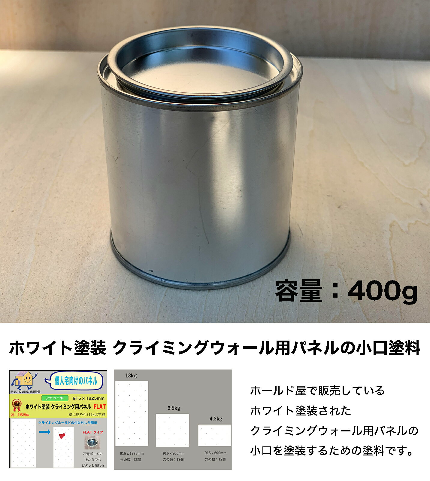 商品説明 ホールド屋で販売しているホワイト塗装済みクライミングウォール専用パネルの補修用塗料 容量 400g 納期 4 - 5日間前後ホールド屋で販売しているホワイト塗装済みクライミングウォール専用パネルの補修用塗料