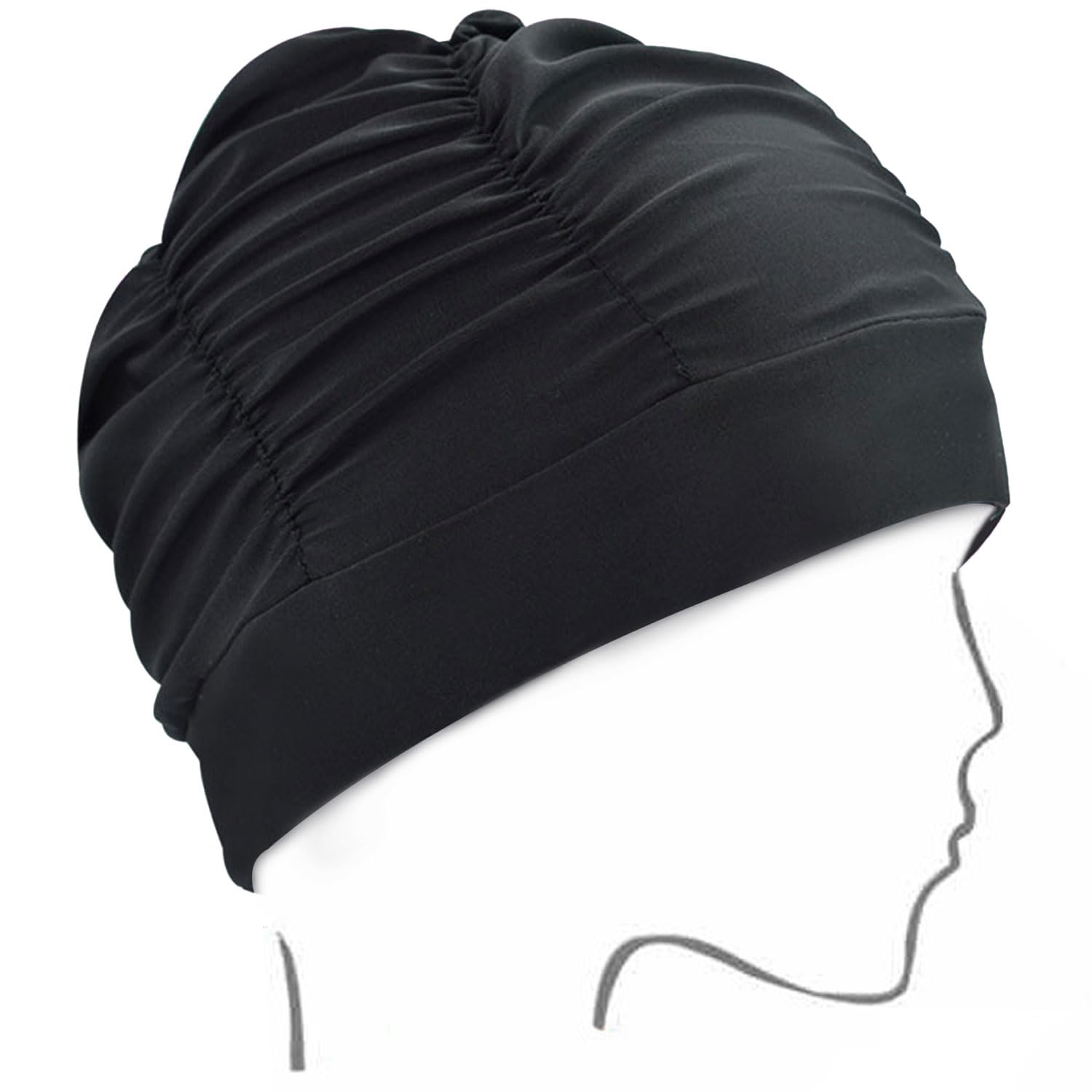 【送料無料】水泳帽子 プール帽子 吸汗性と通気性 ナチュラルで肌に優しい 高い伸縮性 ナイロン 特大サイズ 女性用スイミングキャップ 締め付けない プリーツキャップ 色:ブラック、サイズ:フリーサイズ