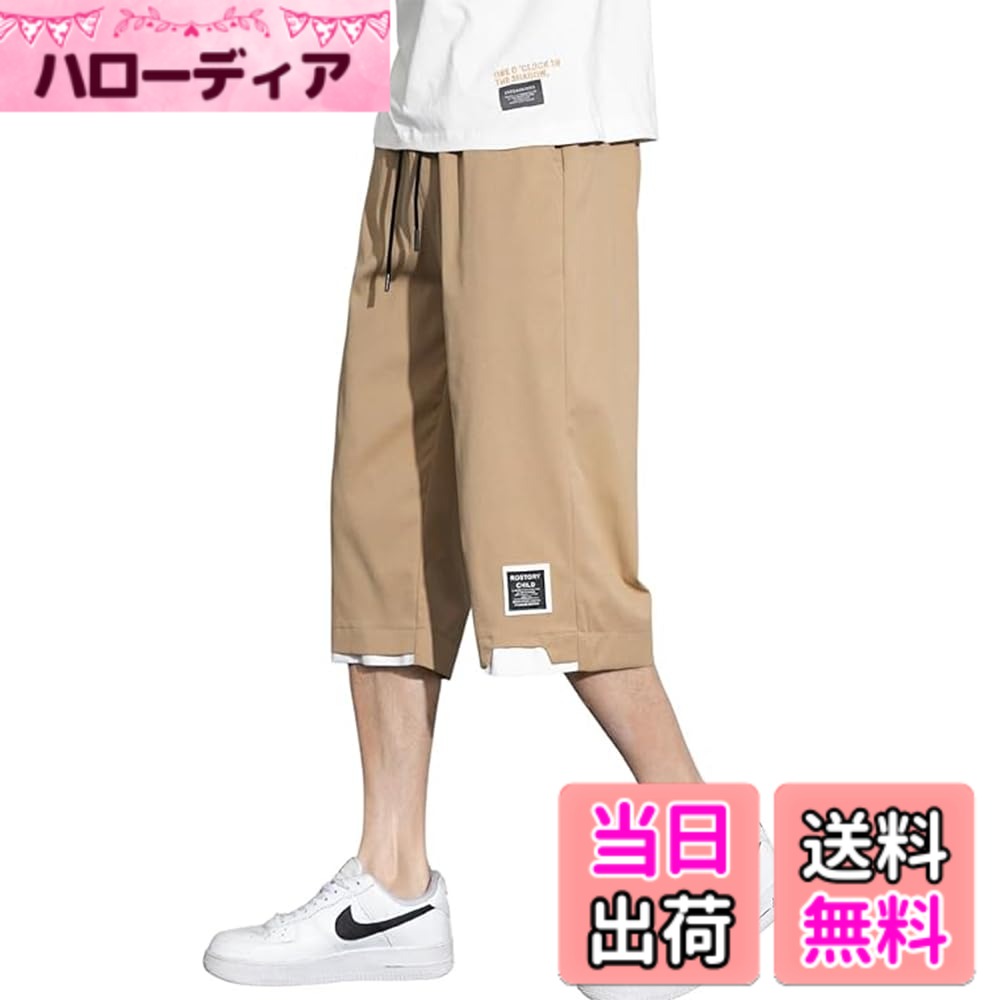 【送料無料】[fyetemon] メンズ ショートパンツ 5分丈 ワイド 大きいサイズ ゆったり カジュアルパンツ ウエストゴム 多ポケット 通気性 夏用 シンプル 無地 色:カーキ、サイズ:M