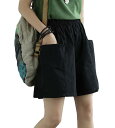 【送料無料】[Fosys] ショートパンツ 短パン レディース ワイドパンツ ボトムス 薄手 ウエストゴム ポケット付き ゆったり カジュアル 夏 色:ブラック、サイズ:XL