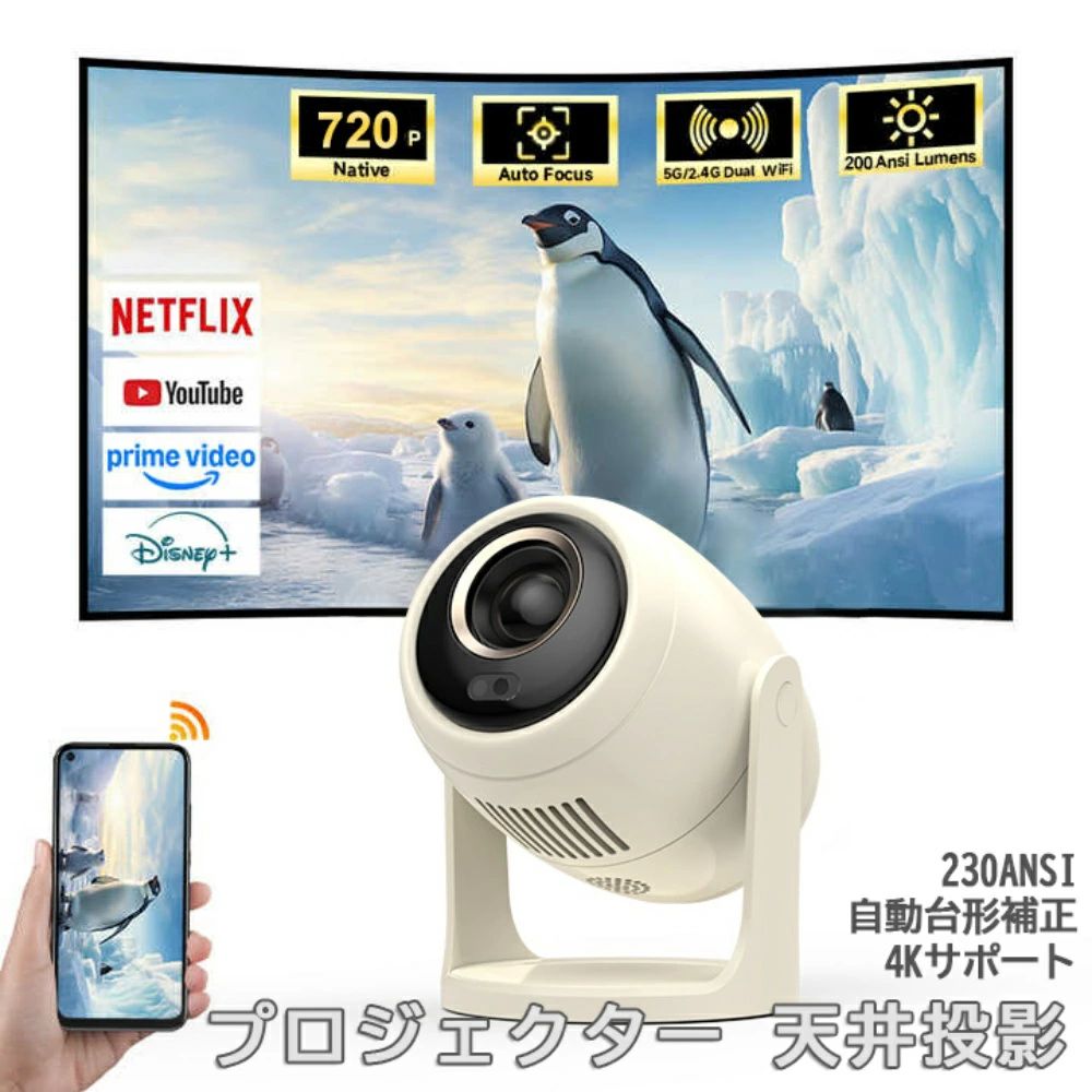 プロジェクター 小型 家庭用 天井投影 スマホと繋げる 1080P&4K対応 スマホ 高画質静音 自動フォーカス 自動台形補正 高輝度 Netflix/YouTubeb android搭載 ホームシアター 壁 簡単設定 リモコン付属 敬老の日プレゼント 父の日 母の日