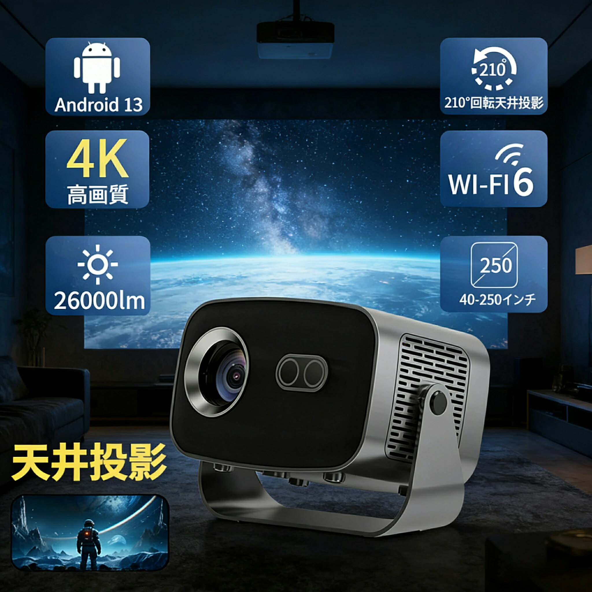 商品情報商品【26000ルーメンの高輝度】26000ルーメンの高輝度で、鮮やかでクリアな映像を映し出します。フルHD解像度に対応し、細部までくっきりと描写され、豊かな色彩でまるで映画館のような臨場感をお楽しみいただけます。投影サイズは40~250インチに対応しており、大画面で高画質のホームシアター体験を実現します。【短距離投影&自動台形補正】このスマートプロジェクターは自動台形補正技術,横置きでも斜め置きでも、垂直方向の自動台形補正機能により、傾いた画像を自動的に補正し;電動フォーカス技術搭載、わずか数秒で完璧な画像が得られます;このポータブルプロジェクターは短距離投影も備えており、投影距離は1~5メートル、40~250インチの大型スクリーンに対応している【超高速5G&2.4G・Wi-Fi 6・Bluetooth5.3対応】プロジェクターは、超高速5G&2.4Gと先進のWi-Fi6技術を搭載しており、遅延を最大60%削減されて、より高速で安定したインターネット接続を実現します。Wi-Fi経由でiOS、AndroidおよびWindowsデバイスを素早く接続でき、超スムーズで遅延のないオンラインゲーム、映画鑑賞、ビデオ学習体験を簡単に楽しむことができます。また、Bluetooth5.3も搭載し、ご愛用のスピーカーやワイヤレスイヤホンやから音声を流すことができ、迫力ある映像をこだわりの音響環境で映画館のような雰囲気を楽しむことができます。【Android TV搭載】プロジェクターにはAndroid TVが内蔵されており、Wi-Fiに接続すれば、インストールされたアプリを介してお気に入りの映画やテレビ番組を視聴することができます。8,000以上のアプリで50万本以上の映画やテレビエピソードをAndroid TV プロジェクターで楽しむことができ、Prime Video、YouTube、Netflixなどの様々な映画やビデオを大画面で楽しむことができます。【多彩な互換性】この家庭用プロジェクターはWi-Fi、Bluetooth接続以外に、HDMI、USB端子が搭載しており、ノートパソコン/スマホ/TVボックス/DVDプレーヤー/USBメモリー/Google Chrome cast/X-Box/PS3/PS4など様々な周辺機器に接続できます【210°回転・スタンド一体型】プロジェクターには210°回転可能なスタンドが付属し、自動台形補正機能により、真の自由な投影を実現します!プロジェクターは取り付け不要で、設置場所に制限がなく、どの角度から見ても、一度のクリックで最適な画面に補正と調整できます。 メーカー希望小売価格はメーカーサイトに基づいて掲載しています メーカー希望小売価格はメーカーサイトに基づいて掲載しています メーカー希望小売価格はメーカーサイトに基づいて掲載していますプロジェクター 業務用 電動フォーカス 小型 天井投影 4K対応 超高清 高輝度 Netflix/YouTubeb Android 13 高画質 静音 自動台形補 軽量 5G wi-fi 6 Bluetooth 5.2 ホームシアター 子供 壁 簡単設定 HDMIケーブル・リモコン付属 家庭用 2年保証 3D 180°回転 Android 13.0 映画 PC/PS5/Switch/FireTV Stick/DVD/USBなど対応 コンパクト Netflix、Prime Video、YouTube 安い 持ち運び 一人暮らし もらって 嬉しい ランキング PSE認証 5