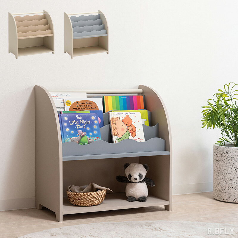 優美な曲線が空間を彩るウェーブデザイン。 波打つようなフロントデザインが、お部屋に柔らかなリズムを生み出すブックシェルフ。 落ち着いたニュアンスカラーとマットな質感がインテリアに心地よく馴染み、洗練された存在感を放ちます。 上段にはお気に入りの本を、下段にはおもちゃやバスケットを自由に収納できます。 絵本棚としてはもちろん、マガジンラックとしても活躍し、実用性と空間のアクセントとなる美しさを両立させました。 サイズ(cm) W62.5×D36×H65 素材 合成樹脂化粧繊維板 スチール(粉体塗装) 商品重量 13.5kg 耐荷重 20kg 生産 中国製 備考 組立式 【特記事項】 ※写真の雑貨類は付属いたしません。 ※ 商品の写真は、なるべく実物に近い状態になるよう努力しておりますが、光の具合やパソコンのモニターの種別、環境によっては、見え方が実際のものと多少異なって見える場合もございますので、ご了承ください。 ※品質改良のため、予告なく仕様やデザインが変更となる場合がございます。
