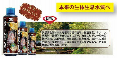 驚異の濃度実現! これがブラックウォーターだ! ■天然腐植酸を極めて濃く含みます。 抗酸化作用で自然本来の水に近づけて、ストレス軽減、色揚げ、産卵促進など、良い効能があります。 ■天然の病原菌抑制物質で、病気になりにくい水を作ります。 ■pH緩衝作用でpHショックを防ぎ、弱酸性軟水にします。 ■天然のコケ抑制物質で厄介なコケを抑制します。 ■塩素中和・重金属無害化します。 従来のダブルブラックウォーターを更に追求したプレミアムタイプがトリプルブラックウォーターです。 ご使用方法 ●ご使用前によく振ってからご使用下さい。 ●内キャップは5ml、キャップ一杯20mlです。 ●10~12Lあたり1ml~2ml、定期的な使用には1週~2週あたりに同量割合で添加して下さい。 ●ご使用後はキャップをしめて冷暗所で保管して下さい。 ※本品には製品上の色合いで、危険なものではありませんが、本品が皮膚や物に垂れると色が落ちにくいのでご注意下さい。 また、その他注意点はボトル記載のものをお読み下さい。