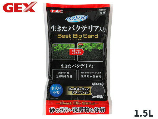 GEX ベストバイオサンド 1.5L 砂の汚れ・沈殿物を分解フンや残餌等の有機物を分解するバチルス属のバクテリアを配合。また、有機物を分解する時に必要な『酵素』を吸着しやすい『天然黒ボク土』を採用。すばやく水を立ち上げ、長期間きれいな状態を維持します。【使用環境】 淡水 【粒サイズ】 2〜4mm【材質 素材】 天然黒ボク土、ヤシ殻活性炭(バチルス菌入り)・上部フィルターを使用する場合は、吐出口に岩・流木などを置くか、エルボを使用するなど、水流が直接砂利にあたらないように工夫してください。・底面フィルターを使用する場合は、底面フィルターの上にウールマットなどを敷いてください。【ご 注 意】※納品後の交換は、ご注文品番以外のものが届いた場合を除き、交換・返品などはお受けいたしかねます。※メーカー在庫の為お急ぎの場合は、納期の確認をお願い致します。通常1週間〜10日(土・日・祝日を除く)で発送となります。(土日祝日は定休日の為、発送営業日に含まれませんのでご了承下さい。) ◆当社指定運送会社 送料無料にて発送いたします。◆商品代引きご希望の場合、代引き手数料が別途必要となります。