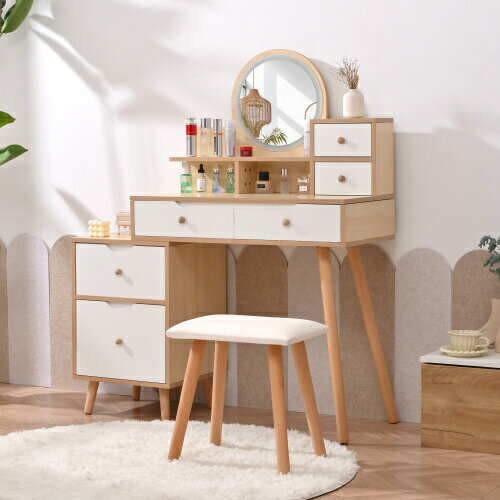 【伸縮式収納】95cmと105cm、2つの段階で調節可能な伸縮性のあり、これにより、住宅の間取りに合わせて柔軟に変更します。また、サイドスペースはベッドサイドテーブルとしても利用でき、本や携帯電話などの小物を置います。【調節可能なLEDコスメミラー】このLEDコスメミラーは3つの光色調節ができ、それに角度も自由に調節できます。ボタンを短く押すと色が変わり、長く押すと明るさが変わります。【収納スペース】上部:垂直な収納設計があり、メイク用品簡単に取り出すことができるので、効率的にメイクを行うことができる、中部:大容量の引き出しが2つあり、キンケア用品やジュエリーなど、さまざまなアイテムを収納します。下部:側面には2つの大きな引き出しがあり、使用頻度が低いの?パック、ティッシュ、ドライヤーなどを収納するのに便利です。【取っ手】木製の取っ手は、優雅な外観だけでなく、快適な握り心地も提供してくれます。【簡単掃除】お手入れ簡単、汚れた時も、カバーは簡単に取り外せることができで、いつでも清潔を保ちます。サイドキャビネットの脚の高さは約13cm、掃除機も通るので、掃除もらくらくです。【高品質な座り心地】座面幅は40cmで厚さは4cm、しっかりとした座感でいながらも、体に負担の少ない座り心地を実現しています。2人で組み立てることをお進めします。