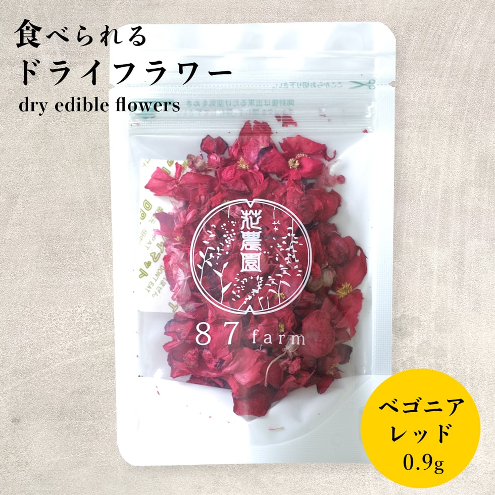 商品情報 商品名 乾燥食用花容量 0.9g原材料 食用花(滋賀県産 ベゴニア)賞味期限 製造より1年製造元 87farm滋賀県東近江市池庄町2125−2生産国 日本(滋賀県)保存方法 ・直射日光及び高温多湿を避けて冷暗所で保存してください。・開封後はお早めにお召し上がりください。パッケージについて 商品パッケージのデザインは資材などの関係で予告なく変更になる場合がございます。商品内容につきましては同じものとなります。食べられるドライフラワーベゴニア レッド エディブルフラワー(食用花)のドライフラワー! お料理やお菓子作りのアクセントにいかがでしょうか。 食べられるお花 エディブルフラワーって何? エディブルフラワーとはEdible(食べられる)Flower(花)の文字通り、食用花のことを指します。 農林水産省のガイドラインに基づいて食用としてハウスで育てており、安全に栽培されたお花です。化学農薬を使わないため通常のお花よりも丁寧に育てられています。滋賀県東近江市で栽培されたエディブルフラワー(食用花)を乾燥させてドライフラワーにアレンジ。 お料理やお菓子作りのアクセントにいかがでしょうか。 食事がおいしくなる魔法のアイテム 人は視覚からある程度味を予想し、おいしさを評価するそうです。食用花は、実際の味ではなく、見た目からおいしさを創造する魔法のアイテムです。 食用花ができるまで 繊細かつ自然由来である食用花の生産は、決して容易ではありません。食用とするため、農薬を使わない自然栽培を徹底。虫除けのためにビニールハウスを設置して、多いときには一日に3回水を散布し、夏にはミストも稼働します。商品として出荷可能なレベルに育つのは、咲いた花の約3割から5割という少なさ。さらに収穫にも細かな配慮が必要です。真夏の昼間に収穫すると、わずか数分で花が枯れてしまうため、収穫は早朝または夕方のみ。真冬は逆で、花に元気が出る昼間に収穫しています。 自然豊かな山から湧き出た地下水 87farmのエディブルフラワーは、滋賀県と三重県の県境にある自然豊かな鈴鹿山脈から琵琶湖に向かって流れる地下水で栽培し、一輪一輪手作業で収穫しています。 専用の加工所で新鮮なうちに掃除しています ハウスで摘みたての新鮮な食用花は、すぐ近くの加工所で花びら一枚一枚手作業で掃除しています。お花はとても繊細です。軽く水洗いし、その後は手作業でチェックをしています。 1
