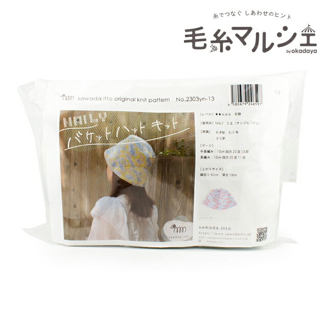 Product Features商品説明夏の編み物にぴったりな糸[NAILY]で編む、爽やかカラーのバケットハットキット。長めのブリムで目深に被ることができるデザイン。カスリカラーがシンプルな編み方でも映えて、コーディネートのアクセントにもなります。・洗濯機[弱]・手洗い推奨(陰干し)・漂白剤・ドライクリーニング不可商品情報セット内容NAILY…3玉(サンプル:104g)、編み図素材NAILY…ナイロン100%難易度初心者向け用意するものかぎ針8/0号、とじ針出来上がりサイズ頭回り60cm、深さ19cm他のカラーはこちらご注文前に必ずお読み下さい【ご注意】濃色品は染料の性質上、色落ちしやすいので、白・淡色品と分けて洗って下さい。紡績・撚糸・玉巻加工の製造工程で、玉の中に結び目が発生する場合がございます。ご了承下さい。・表示価格は1セットの価格です。・ご覧になるディスプレイ環境により、実際のお色と異なる場合がございます。・予告なくパッケージが変更になる場合がございます。・染色ロット、製造ロット、ディスプレイや視覚環境などにより、実際のカラーと異なる場合がございます。・当社の他オンラインショップと在庫を共有しており、注文が確定しても完売・欠品の場合があります。予めご了承下さい。