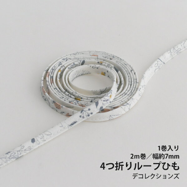 ★30%OFFクーポンBLACK FRIDAY★4つ折りループひも/7mm幅 Find the animals - forest 【2m巻】【メール便対応】 テープ/紐/巾着ひも/コットン/入園入学/材料/素材/パーツ/手芸 【動物】【花】【葉】【ナチュラル】【白】北欧 おしゃれ かわいい デコレクションズオリジナル