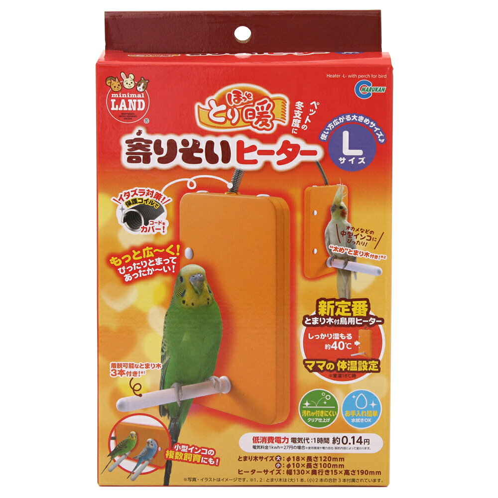 メーカー:マルカン品番:RH-212ママの体温設定!マルカン ほっととり暖 寄りそいヒーター L対象小鳥全般特長●新発想の止まり木付き鳥専用ヒーターです。 ●寒いときに寄り添うことができ、鳥自身で適温調節が可能です。 ●止まり木を外し、横向きに取り付ければ巣箱などを下から温めることが可能です。 ●水拭き可能なのでお手入れが簡単です。 ●表面をクリア加工しているため汚れが付きにくいです。 ●ママの体温設定をしているので鳥ちゃんがしっかり温まれます。 ●いたずら対策で、保護コイルでコードをカバーしています。 ●最大で3つの止まり木を付けることができます。 ●大きめの止まり木はオカメインコなどの中型インコにぴったりです。数量1個仕様定格電圧:100V 定格周波数:50Hz/60Hz共用 定格消費電力:5W 表面温度:40℃前後 安全装置:PTC、ヒューズ 電気代(1時間当たり):0.14円サイズ(約)本体:幅13×奥行き15×高さ190mm ※止まり木装着時:奥行き145mm 電源コード:1m(内、保護コイル:12cm) 止まり木(大):直径18×長さ120mm 止まり木(小):直径10×長さ100mm重量(約)250g材質ヒーター本体、止まり木:ABS 保護コイル:鉄原産国中国ご使用方法●鳥ケージのワイヤー部分を通し、真っ直ぐに固定してください。 ●ワイヤーを広げ、コード部分を出してお使いください。 ●本品は水入れと反対側に設置してください。 ●コンセントの抜き差しは必ず電源プラグを持って行ってください。 ●長期間留守にされるときや、本品を使用しないときは必ず電源プラグをコンセントから抜いてください。 ●長時間連続で使用される場合には、時々本体からペットを離して脱水症状や低温やけどをしないように注意してください。 【お手入れの仕方】 ●お手入れの前には必ず電源プラグをコンセントから抜いてください。 ●電源プラグには水がかからないよにしてください。 ●汚れがひどいときは中性洗剤を含ませた柔らかい布やタオルで拭いてください。 ●本体に付いた汚れや洗剤などはきれいに拭き取ってください。ご注意※本品は小鳥用のパネルヒーターです。目的以外の用途では使用しないでください。 ※タワシやブラシを使用すると表面が傷つくため使用しないでください。 ※漂白剤、シンナー、ベンジンなどの薬品や熱湯の使用はさけてください。商品が変形する恐れがあります。 ※コードの保護コイルがない部分が鳥ケージの中に入らないように注意してください。 ※電源コードをペットに噛まれないように注意してください。 ※ケージの側に電源コードが垂れ下がっていると足で掴んでたぐり寄せて噛み切ってしまうことがありますので取り回しご注意ください。お問い合わせについて商品の不明点につきましては、下記にお問い合わせください。株式会社マルカンTEL:072−931−0345マルカン インコのおやつ かじりま専科 2本入り×6袋 鳥 おやつ スナック・ビスケットマルカン かじり木コーン M おもちゃ うさぎ ハムスターマルカン キティケージ1000 ブラウン(69×56×98cm) CT−451 180サイズ 猫 チンチラ ケージ … marukan heaterhon 20190908 kszk 鳥用品 鳥 インコ 小型インコ 小鳥 オカメインコ セキセイインコ ブンチョウ 文鳥 十姉妹 ジュウシマツ カナリア 保温 寒さ対策 冬 パネル 固定 止まり木 4906456570042 マルカン ほっととり暖 寄りそいヒーター L opa2_delete line22115mini y19m09■この商品をお買い上げのお客様は、下記商品もお買い上げです。※この商品には付属しません。■マルカン インコのおやつ かじりま専科 2本入り×6袋 鳥 おやつ スナック・ビスケットマルカン かじり木コーン M おもちゃ うさぎ ハムスターマルカン キティケージ1000 ブラウン(69×56×98cm) CT−451 180サイズ 猫 チンチラ ケージ