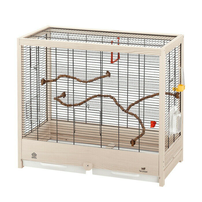 イタリアferplast社製。カナリア、インコなど小鳥用で、えさ入れや水のみ容器やとまり木など付属しており、すぐに飼育できるフルセットです。木製の風合いとスチールネットで、シンプルながら高級感があふれる鳥かごで、どんなお部屋にもマッチします。見た目だけでなく、お世話がしやすいよう設計されております。前面に引き出しがついており、底網はサイドから引き出せます。日常の糞や餌の食べ残しのお手入れが楽にできます。止まり木は好きな形に変えれるので、鳥ちゃんの好みで変更してあげて下さい。360度全ての角度から小鳥の様子が伺えますので、楽しくコミュニケーションしたり眺めたり、安全管理も行き届きます。※イタリアのメーカーより商品の仕様、セット内容など変更が頻繁にありますので商品写真と異なる場合がありますがご了承下さい。例)犬猫用品や鳥用品、小動物用品の色・デザイン・サイズ・パーツの数が画像と違う等 。【本体サイズ】580×690×345mm【材質】 スチール、プラスチック、木【メーカー名】株式会社ファンタジーワールド【原産国または製造地】 スロバキア