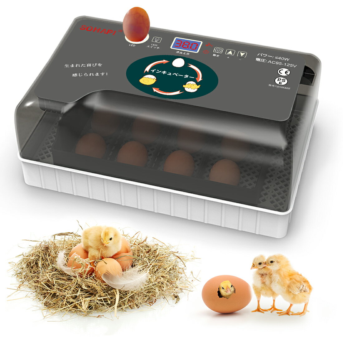 製品仕様本体サイズ:32×20.8×12CM 包サイズ:37×25×17CM 重量:1.25KG 素材:ABS材料 電圧:AC95~125V 周波数:50/60Hz 消費電力:最大40W 温度設定範囲:20.0~40.0 ℃ 入卵数 :鶏卵×12個、アヒル卵×9個、ガチョウ卵×4個、ウズラ卵×35個 パッケージ内容:蓋*1、ベース*1、卵トレイ*1、グリッド*1、スティック* 6、回転軸*1、電源コード*1、日本語説明書*1商品特徴【自動転卵機能】 サイトスライド式自動回転卵の技術を採用して、自動化のため、人工的な操作が不要で、卵を孵化する過程全体が非常に秩序化され、孵化率が大幅にアップします。 【多種類な卵を自動孵卵可能】 孵化条件を設定することで、いろんな鳥類の孵卵にチャレンジできます。鶏、クジャク、七面鳥、アヒル、ガチョウ、鳩、山鶏、土鶏などにも対応できます。 【検卵LEDライト付き】 検卵LEDライトが搭載され、胚の発生が確認できます。 【自動温湿度制御】 エネルギーを節約して、定温と湿度を保つことができます。予め温度を設定しておくだけで定温を保ち、高温低温高湿低湿になったときにアラームで知らせてくれ、簡単に温度と湿度の両方を管理できます。低温度湿度は警報がありますので、任意のボタンを押して警報をキャンセルします。 ※本体の温度センサーと市販の温度計では、表示に差が出ることがあります。 出荷前に適切な温度・湿度に調整済みですので、ご安心ください。 フタの開け閉めが多いと、孵化に影響する場合がありますので、できるだけお控えください。 【排水穴の設計】 底に排水穴が2つあり、卵が水没するのを防ぐ。 【低騒音で作業できる】 この孵化器は騒音が減る内蔵ファンがあります。低騒音で、作業する時雛が怖がりません。 【電源ケーブルコネクタ】 隠された電源コンセント、埋め込みプラグの設計により、防水性が向上します。もっと安全で、寿命が長いです。キーワード孵卵器 孵化器 転卵 ヒヨコ アヒル 鶏 鳥類 うずら 卵 烏骨鶏 小鳥 文鳥 自動孵卵器 孵卵 器 インキュベーター 検卵 恒温器 鳥類専用ふ卵器 孵化器 自動転卵式 アヒル 鶏卵 アヒル うずら 恒温孵化器 温度 孵卵器 おすすめ 父の日 母の日 ギフト 母の日 プレゼント 贈り物 バレンタインデー 誕生日 こどもの日 元日 成人の日 ハロウィーン 誕生日プレゼント クリスマスプレゼント おしゃれ バレンタインデーPSEマーク取得済みPSマークの種類:PSE 届出事業者名:Guangzhou Xuntao International Trade Co., Ltd 登録検査機関名称:Shenzhen C-Star Test Co., Ltd.メーカー希望小売価格はメーカー商品タグに基づいて掲載しています関連商品はこちらペットウォーターボトル 犬グッズ ペッ...キャットホイール ルームランナー 猫 ラ...据え置き型 キャットタワー 天然木 高さ...クールリング ネッククーラー 24℃以下で...