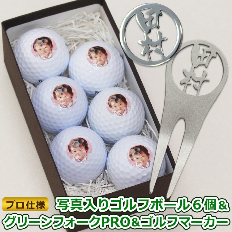 <プロ仕様> ゴルフボール【写真・ロゴ入り 6個】&ステンレス切り文字【グリーンフォーク「PRO」1個】&【ゴルフマーカー1枚】ギフト3点セット ゴルフ 中級者 上級者 名入れ フォーク マーカー プレゼント ホールインワン 記念品 退職祝い テーラーメイド