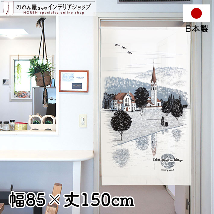 【エントリー&抽選で最大100%Pバック】のれん 85cm幅 150cm丈 Clock tower in Village ホワイト ブルー グレー 風景 景色 街並み 植物 レース おしゃれ 暖簾 ノレン 間仕切り カーテン タペストリー ポスター 目隠し 玄関 階段 洗面所 部屋 仕切り 棚 パントリー