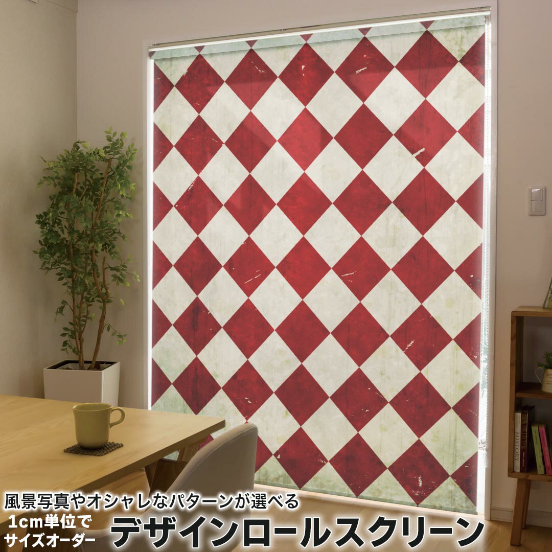 1cm単位サイズオーダー ロールスクリーン ロールカーテン オーダーメイド タチカワ 日本製 間仕切り カーテン 採光 非遮光 目隠し UVカット カーテンレール チェーン式 プル式 005132 チェック・ボーダー ビンテージ 赤 白
