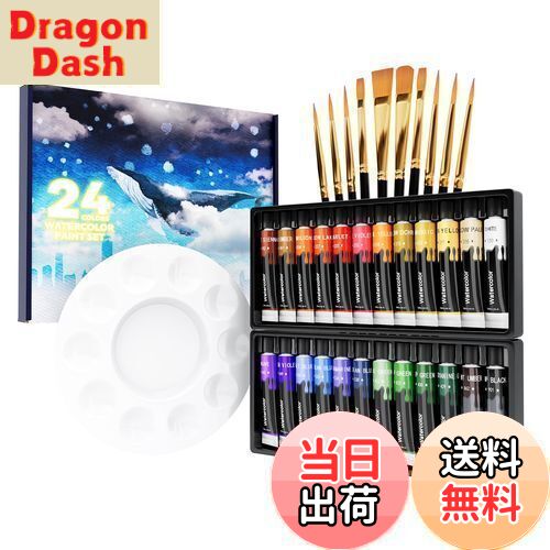 【送料無料】35点セット 透明水彩絵の具 24色 10本ブラシ&1個パレット付き チューブ 耐久性 速乾 手作り 手軽 木/卵/陶器/布に描ける 子供用 イラスト 塗り絵 クラフト 美術 画材 宿題 初心者 専門家 入園・入学お祝い プレゼント