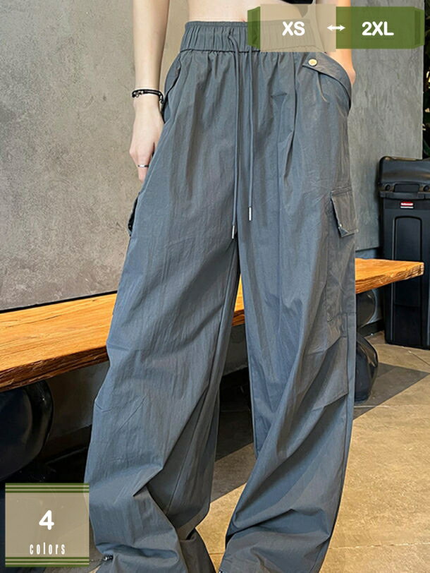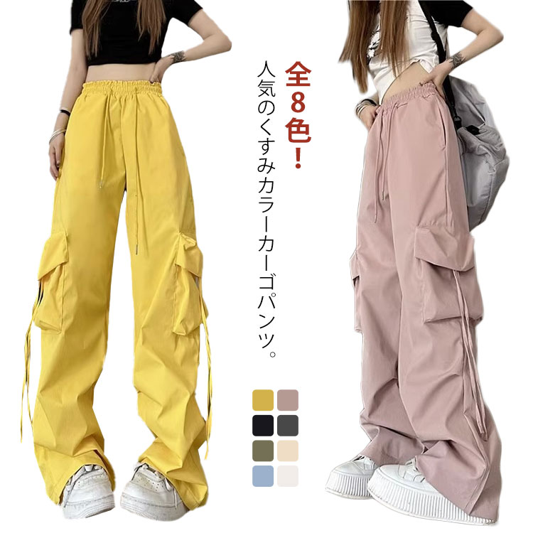 カーゴパンツ カーゴ ワイドパンツ ドロストパンツ イージーパンツ ハイウエスト ブラック グレー ベージュ ブラウン カーキ グリーン 無地 ダンス ヒップホップ 服 パンツ ズボン 【送料無料】