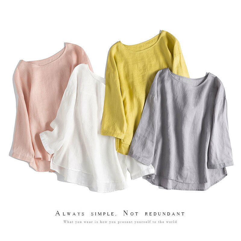 5色シャツ ブラウス 亜麻ブラウス 大きサイズ 森ガール ナチュラル ゆったり レディース 八分袖 亜麻 リネン Uネック シンプル きれいめ
