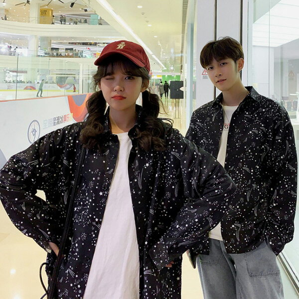 柄シャツ 星柄 ブラック 黒 流れ星 オーバーサイズ 長袖 サテンシャツ ダンス 衣装 ヒップホップ コスチューム 韓国ファッション 大きいサイズ 個性的 春服 秋服 シャツ