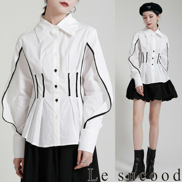 【Le sucood】 フレンチレトロコントラストシャツ シャーリングシャツ デザインシャツ 長袖 ボリューム袖 ブラウス シンプル おしゃれ レディース ストリート系 モード系 個性的 原宿系